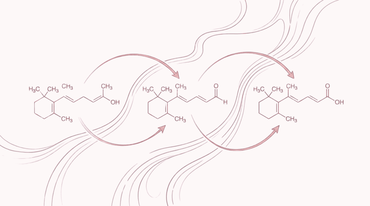 Retinol is an over-the-counter form of vitamin A that converts to retinoic acid in the skin through a two-step enzymatic process. Retinoic acid binds to RAR and RXR nuclear receptors in keratinocytes and fibroblasts, directly activating genes involved in cell turnover, collagen synthesis, and extracellular matrix remodeling. It is the most extensively studied topical anti-aging ingredient, with published trial data spanning decades.